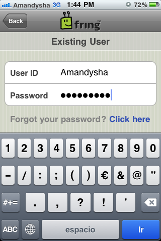 2-Cuando tengas tu cuenta de Fring creada, introduce tu usuario y contraseña para loggearte en la aplicación.