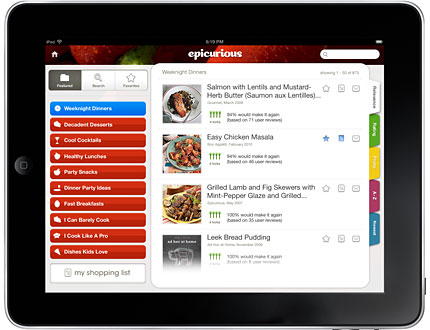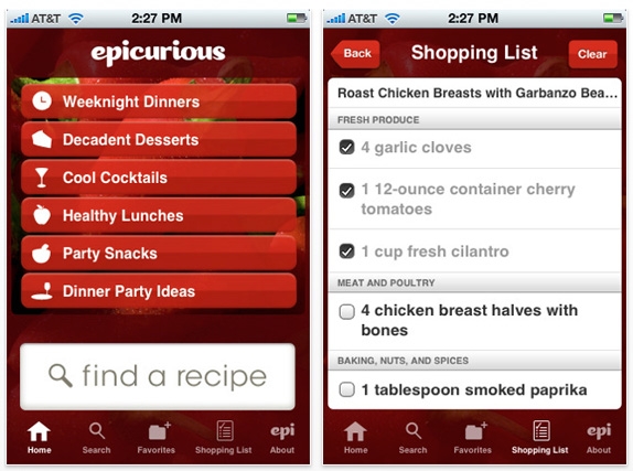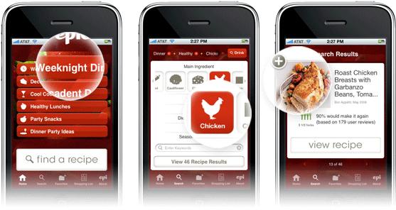 Desde mi punto de vista Epicurious Recipes & Shopping List como aplicación móvil es mucho más flexible y amigable que su página web. La aplicación nos ofrece la posibilidad de buscar un plato determinado con sólo escribir el nombre o también buscar recetas por uno o varios ingredientes principales, por ocasiones especiales como San Valentín, Navidad, Día de acción de gracias, o divididas según el tipo de comida que se amerite como para una boda, aniversario, cena, almuerzo, ensaladas, dietas, etc. Y también contiene indicaciones para preparar tragos y bebidas para adultos y saludables y rápidos postres para niños.